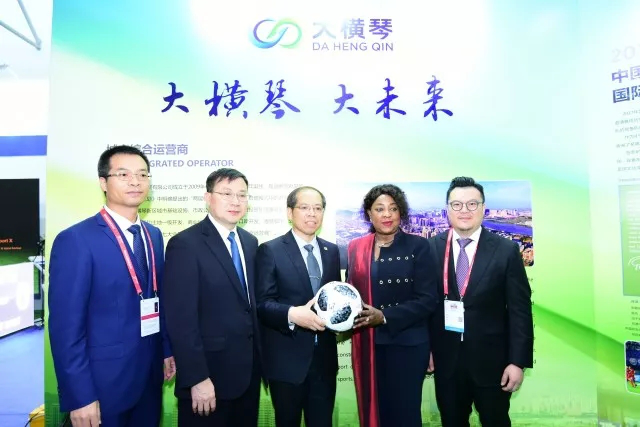 (圖:中國(guó)足協(xié)常務(wù)副主席兼秘書(shū)長(zhǎng)張劍(中),國(guó)際足聯(lián)秘書(shū)長(zhǎng)法瑪特(右2),市委常委郭才武(左2)親臨大橫琴展臺(tái)視察指導(dǎo)。)