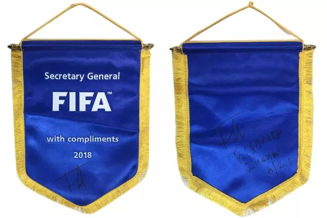 (圖:國(guó)際足聯(lián)秘書(shū)長(zhǎng)法特瑪·薩姆拉贈(zèng)送親筆簽名的國(guó)際足聯(lián)會(huì)旗)