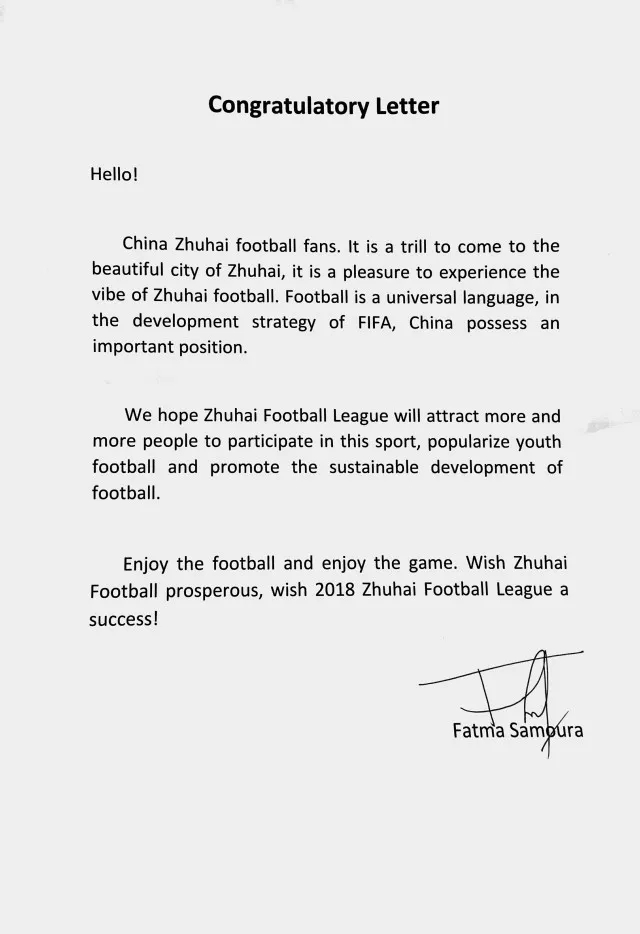 2018珠海市足球聯(lián)賽得到了各方面的關(guān)心和支持,包括國(guó)際足聯(lián)秘書(shū)長(zhǎng)法特瑪·薩姆拉和Soccerex主席托尼·馬丁等國(guó)際足壇巨擘,親自為珠海市足球聯(lián)賽發(fā)來(lái)了賀信。