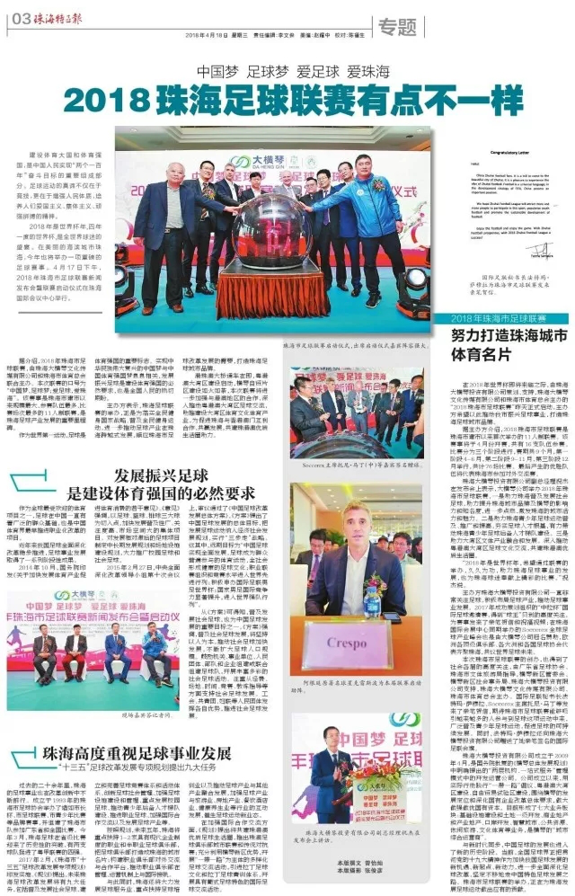 2018年是世界杯年,四年一度的世界杯,是全世界球迷的盛宴。在美麗的海濱城市珠海,今年也將舉辦一項(xiàng)重磅的足球賽事。4月17日下午,由珠海大橫琴投資有限公司策劃、支持,珠海大橫琴文化傳媒有限公司和珠海市體育總會(huì)主辦的“2018珠海市足球聯(lián)賽”昨天正式啟動(dòng),希望以此推動(dòng)珠海市足球事業(yè)發(fā)展,打造珠海足球城市品牌。soccerex主席托尼·馬丁,阿根廷前國(guó)家隊(duì)隊(duì)員、傳奇球星克雷斯波,廣東省足球協(xié)會(huì)副主席、廣東足球運(yùn)動(dòng)中心主任程志文,廣東省政協(xié)委員、澳門中華總商會(huì)青年委員會(huì)主任馬志達(dá),珠海市文化體育旅游局副局長(zhǎng)鄔向明等出席了發(fā)布會(huì)并共同見(jiàn)證了聯(lián)賽啟動(dòng)。