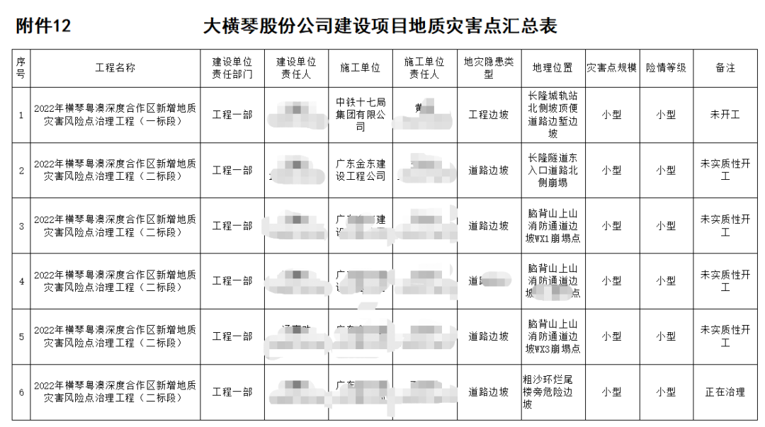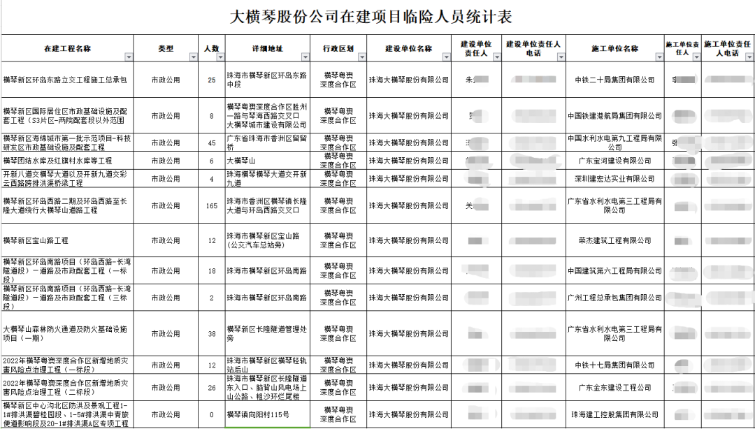 股份公司目前負責建設和運營項目共25個,涉及市政公用、道路、隧道、橋梁、水上等多個領域,涉及臨險轉移人員共2885人。公司已提前布局,對公司管理責任范圍內的地質災害點、排洪渠、建設工地等隱患點,進行系統排查。據統計,今年公司責任區域內隱患點共16處,橫琴7處、富山9處,主要包括2022年橫琴粵澳深度合作區新增地質災害風險點治理工程(一標段),富山工業園二圍北片區二圍北市政配套項目、高標準廠房一期項目、富山工業城二圍北片區廠房一標段項目等。