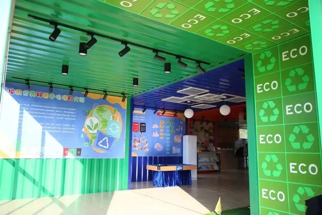 合作區垃圾分類科普中心室內面積達126㎡,以錯位Z型布置的集裝箱,形成內向圍合的宣教場地,整體劃分為科普區、活動區和展覽區三大功能區,是合作區以“綠色、循環、可持續”為垃圾分類宣導理念,打造的集“活動、教育、展學”三位一體的垃圾分類趣味互動學習空間。