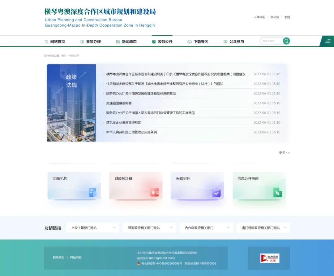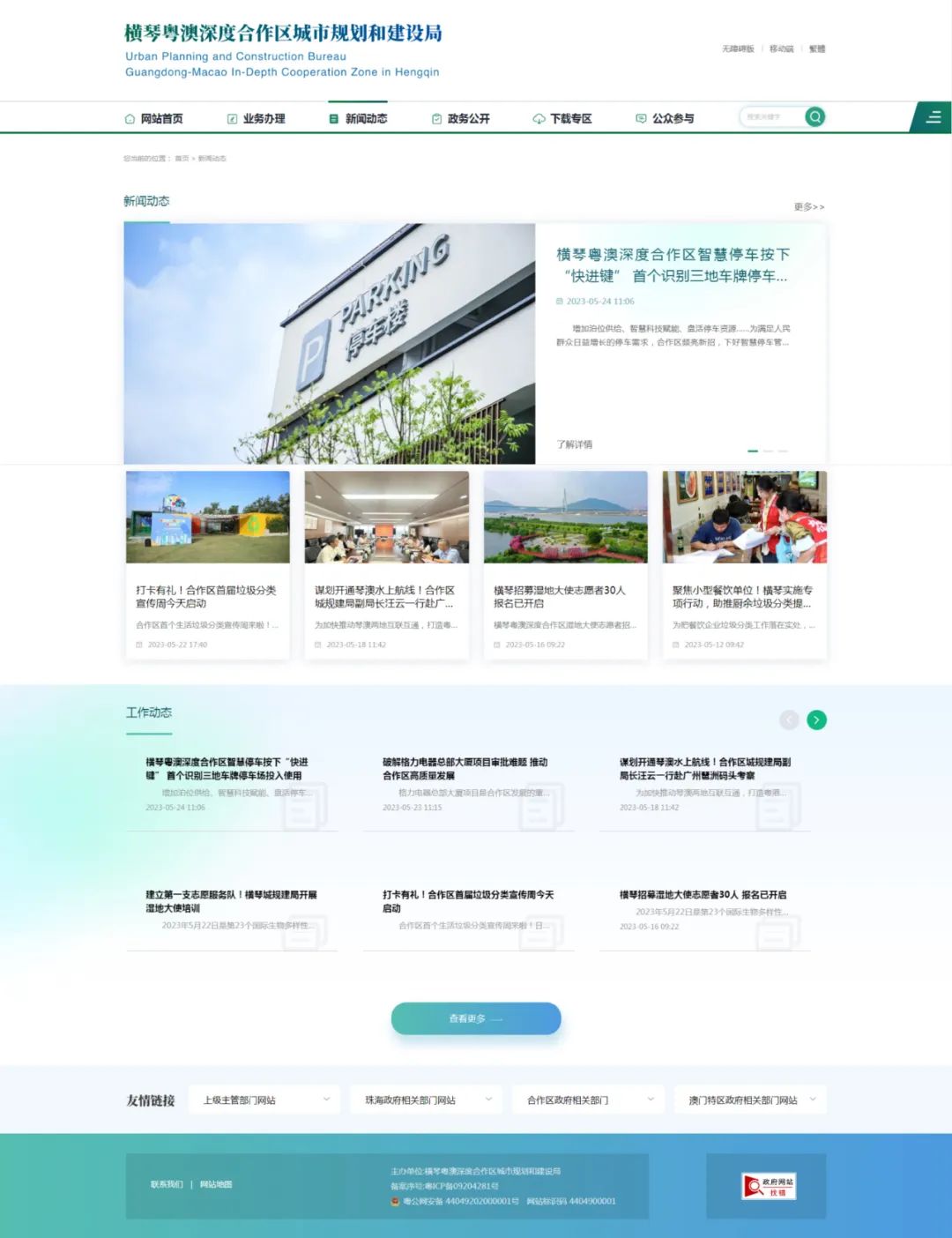 為滿足橫琴粵澳深度合作區城市規劃和建設局政務服務及對外宣傳的需求,進一步便利琴澳居民實現網上辦理事項。近日,由大橫琴科技公司設計開發的合作區城市規劃和建設局官方網站和公眾號已正式上線并投入使用。網站由合作區城規建局指導,法規和科技信息處及綜合事務處組織協調,科技公司網站建設團隊配合,于2022年12月進行實地調研,全面梳理網站和公眾號需求,確定網站以“集約化、扁平化”為原則,公眾號以“欄目策劃和內容展現”為主。近半年來在各單位的共同努力下,今年4月順利完成網站和公眾號上線前的工作。