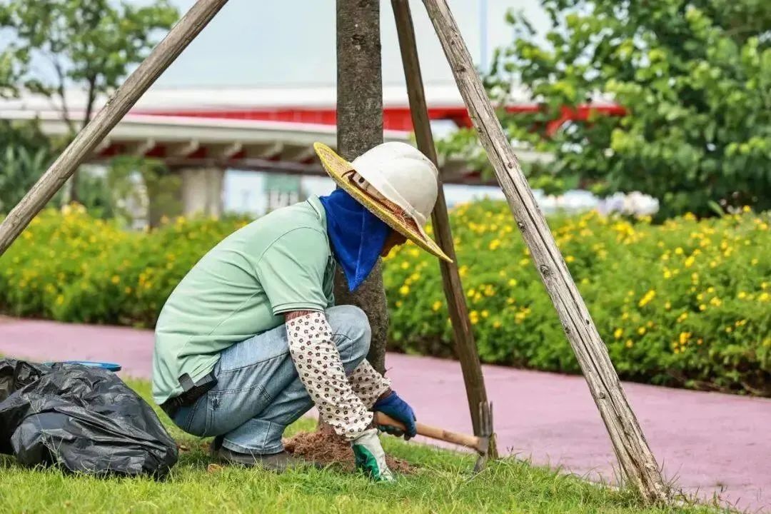 今年三月,琴建公司就對(duì)花海長(zhǎng)廊三大開(kāi)花喬木景觀區(qū)開(kāi)始了樹(shù)盤(pán)梳理、打孔施肥、噴淋系統(tǒng)修復(fù)等工作,在樹(shù)木管養(yǎng)上做到未雨綢繆,在病蟲(chóng)害防治等日常養(yǎng)護(hù)工作之外,提前檢查樹(shù)枝生長(zhǎng)情況、及時(shí)修剪清理枯枝,防止枯枝掉落砸傷游人,有效預(yù)防并減少臺(tái)風(fēng)傷害。