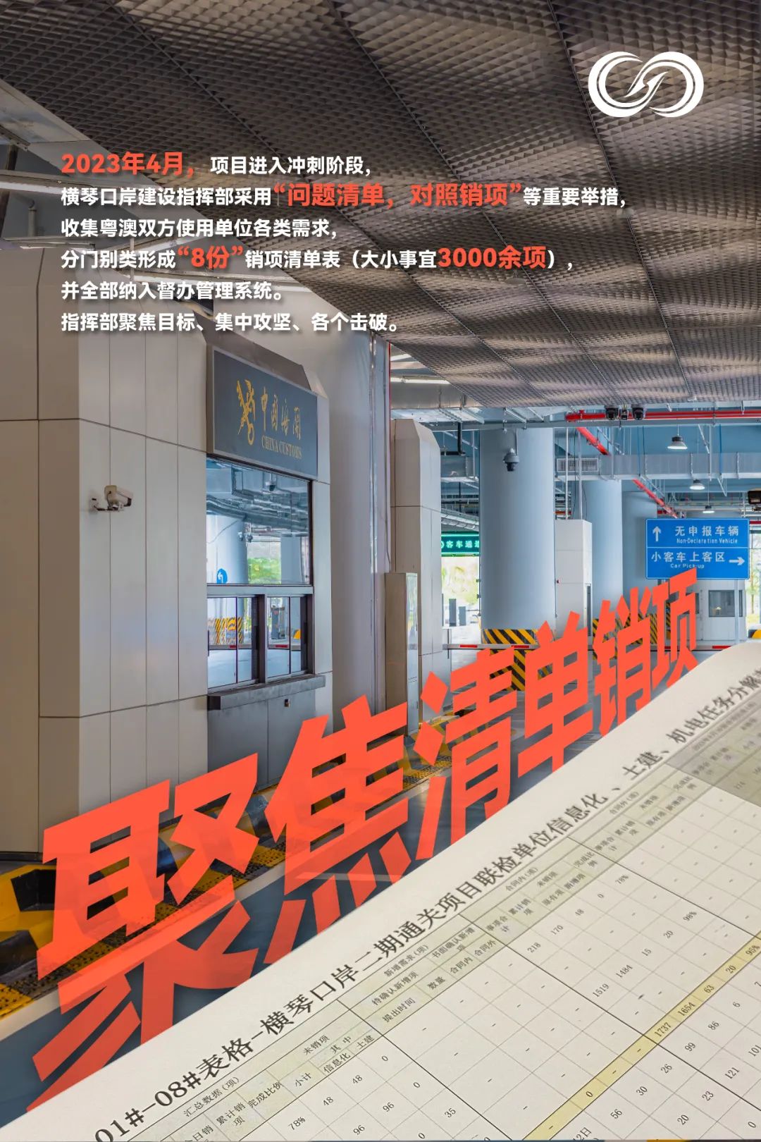 八是清單銷項。口岸指揮部延續“5+2”、“白+黑”的工作模式,解決現場推進過程中遇到的實際問題,確保問題不過夜。沖刺階段,更是堅持每天下午17:00組織參建單位召開工作協調推進會,重點梳理土建工程、信息化工程剩余工作推進情況、材料設備到場情況、質量問題整改情況等,形成8份銷項表,包括粵方海關、粵方邊檢、澳方海關、澳方邊檢、澳方衛生局等需協調解決的問題,實行“問題清單銷項督辦”的機制,要求各責任人“鎖定需求、對表作戰,對照銷項”。據統計,梳理大小問題多達3000余項。