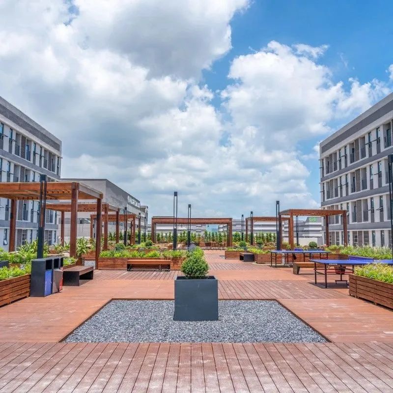公共服務中心三層平臺設置了屋頂花園,形成半開放式創新社區。考慮到公共服務中心宿舍的分布,屋頂花園位于兩側宿舍動線中軸。