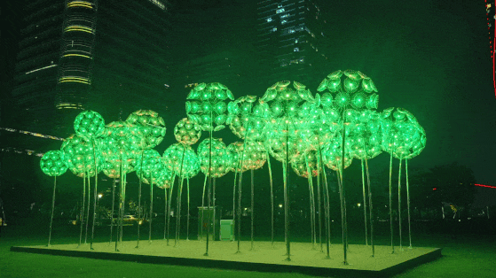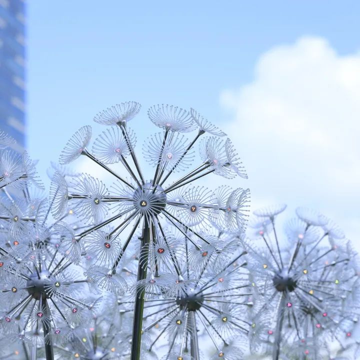 在橫琴金融島中央公園,40支高度為2.5米、直徑為0.6米的蒲公英燈飾如同希望的使者,散發著明亮而溫暖的光芒,為夜幕下的公園增添了一份璀璨的光彩。