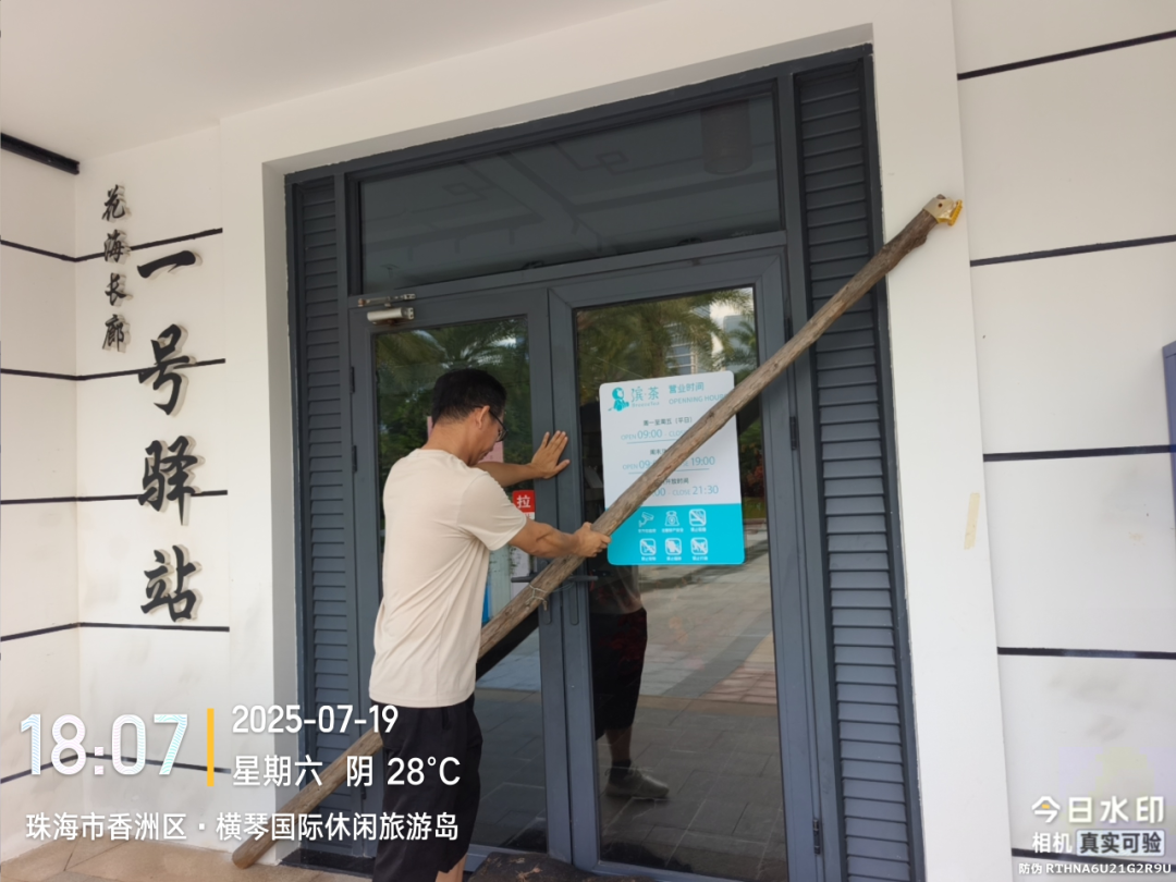 大橫琴泛旅游公司對星樂度·露營小鎮、芒州濕地公園、天湖酒店、天沐酒店、驛站等項目進行巡查,將園區外圍門窗、遮陽傘、垃圾桶等進行加固或回收,檢查各區域易發生進水地點并用防汛沙袋封堵。安全轉移并妥善安置在建項目、運營項目人員,將住宿員工往星旅酒店進行轉移,做好公司防臺值班巡查搶險人員安排,組織246人應對搶險工作。