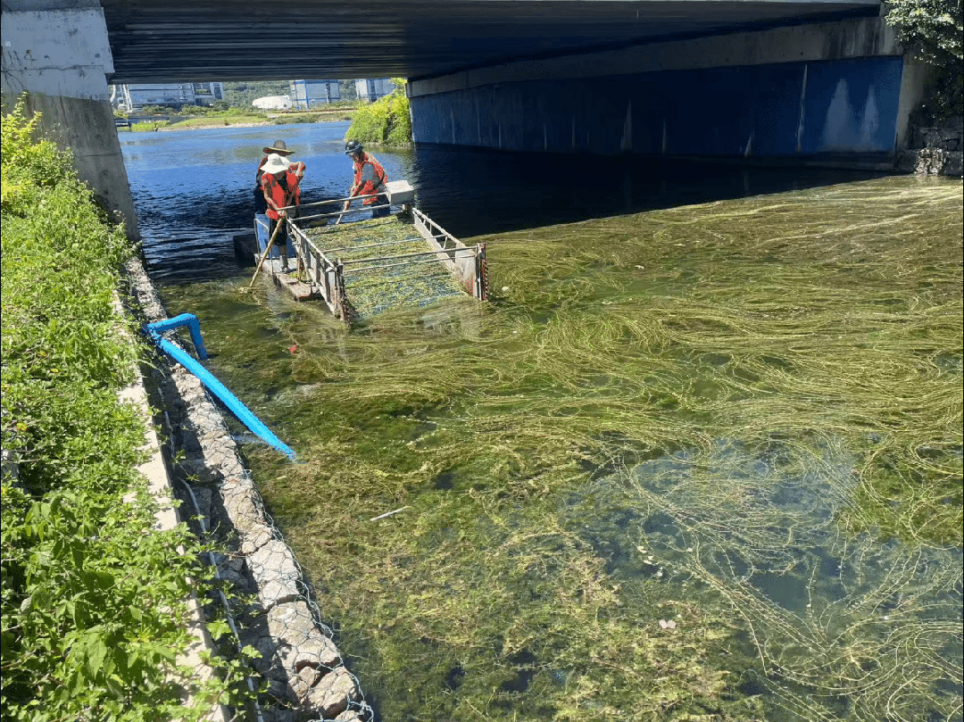 針對不同區域的水草特點,精準施策:大面積區域用機械打撈船快速收割;淺灘水草由專人下水割草;零散水草由保潔船只人工打撈;水面漂浮的斷根水草及浮萍,則利用攔污排攔截,防止擴散。